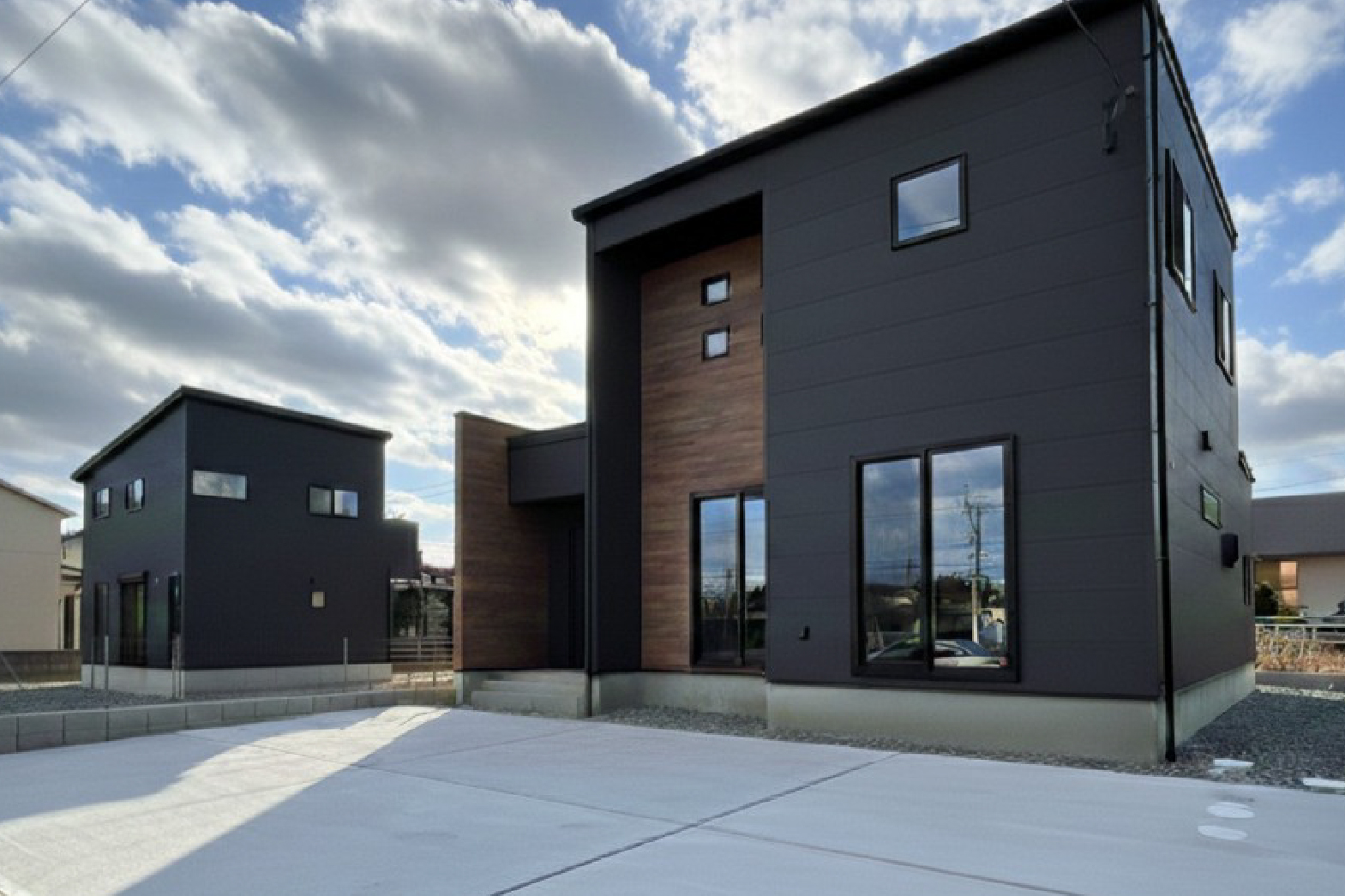 温かな木目のアクセントの重厚感のあるダークトーンの外壁。