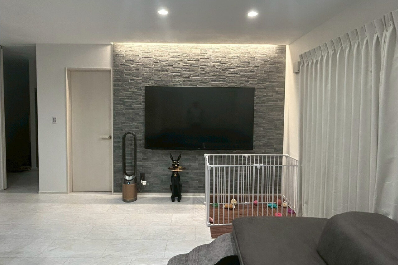 石目調タイルのアクセントウォールと大理石調の床でホテルライクな贅沢空間を演出。