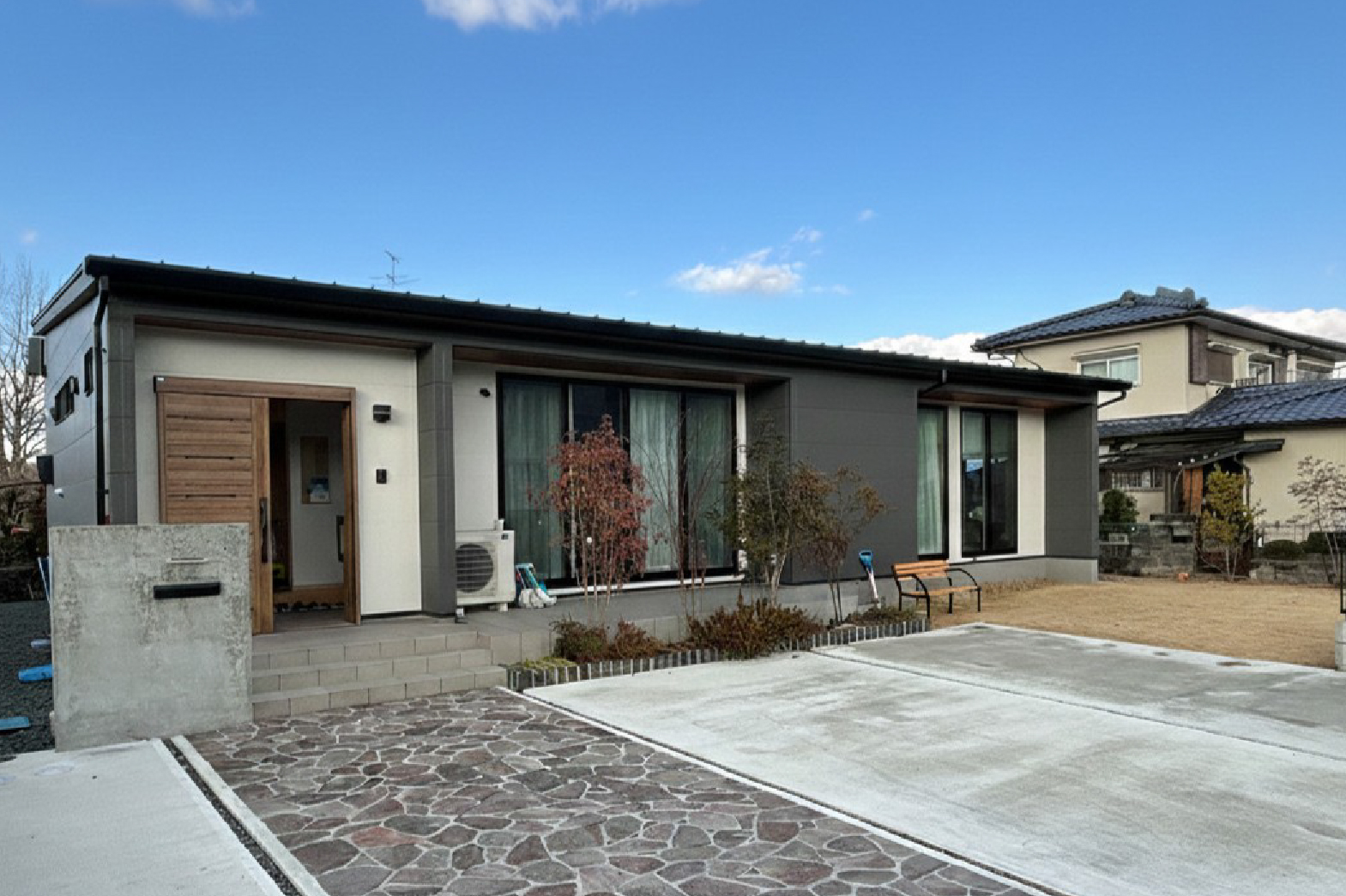 重厚感ある黒のベースに縦ラインの木目リブが映えるモダンな外観。