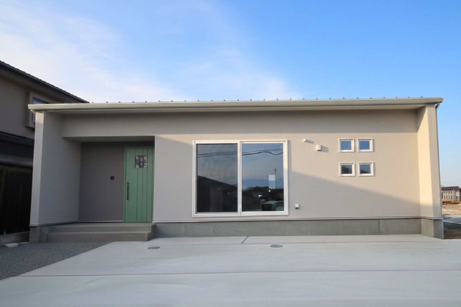 個性豊かなグリーンのドアが美しいアクセント落ち着いたグレーの外観。